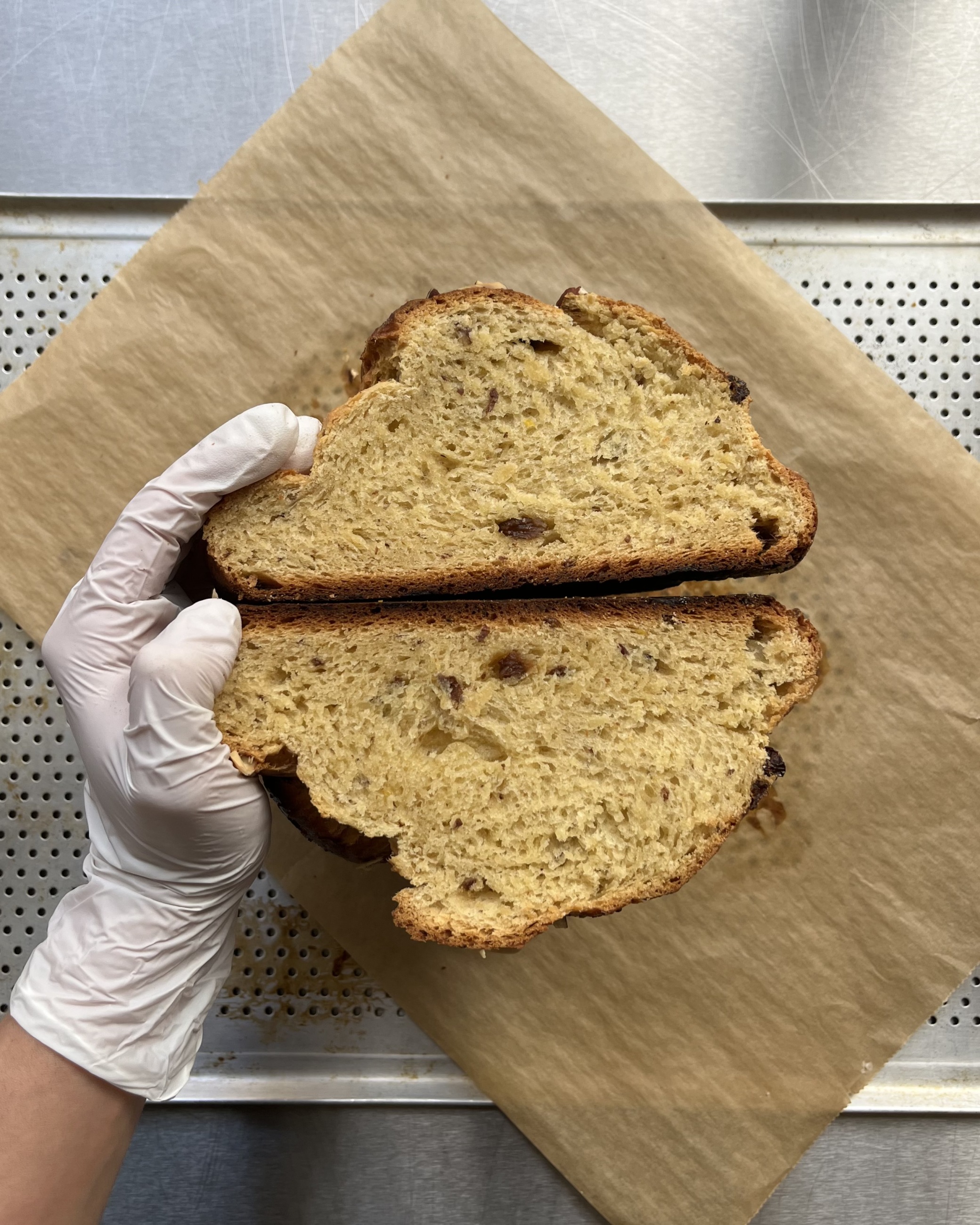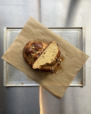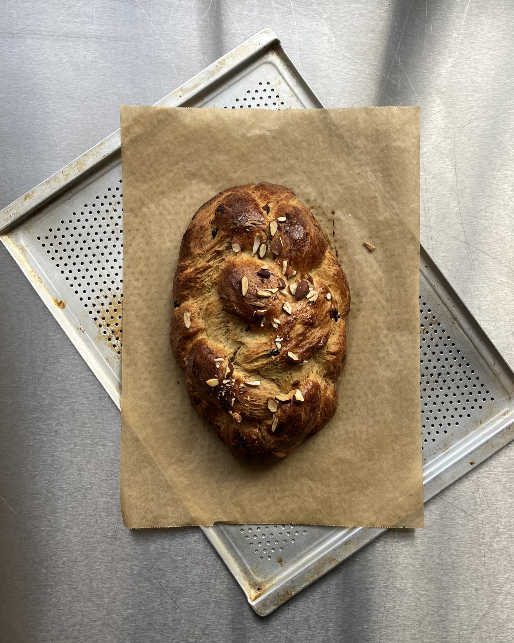 - složení: pšeničná mouka z Dubecka, máslo a mléko z Ovesné Lhoty, vejce od Kubáta, vanilka od Salvátora, mandle Valencia bio, citrón bio, droždí, rozinky, rum, cukr a sůl.